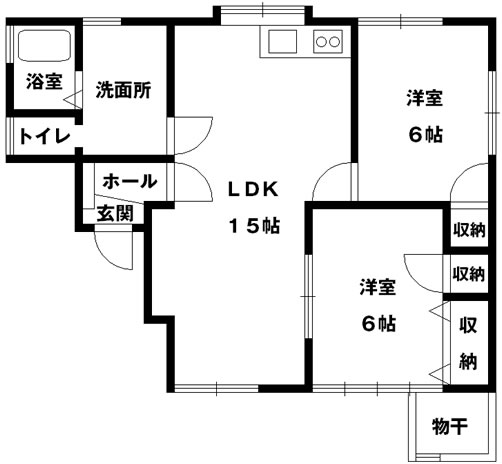 洋室6帖×2室、LDK15帖