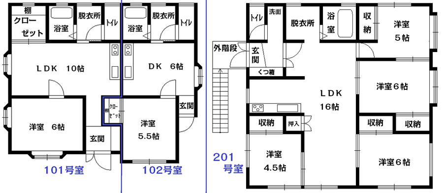 (101号) 43,000円 (102号) 38,000円 (201号) 65,000円 |