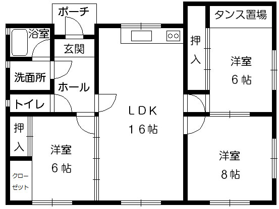 洋室8帖・6帖×2室、LDK16帖